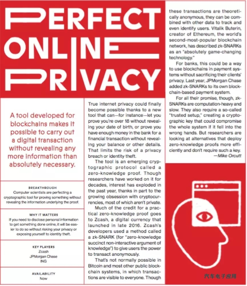 值得注意的是,可能很多人没有注意到的是,在这次榜单中也包含了由当前火热的区块链所衍生的突破性技术—零知识验证(zero-knowledge proof)的新密码协议,与当前多项由区块链技术发展出的加密货币交易有著紧密关系,要如何在几乎完完全公开交易过程中,仍然维持用户的隐私安全性,这一直都是在区块链与加密货币蓬勃发展背后的隐忧。